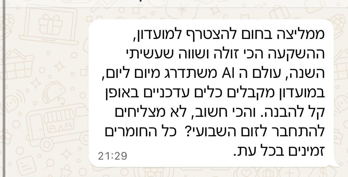 לקבל גישה למועדון הAI המוביל בארץ ולהבטיח שתישאר רלוונטי